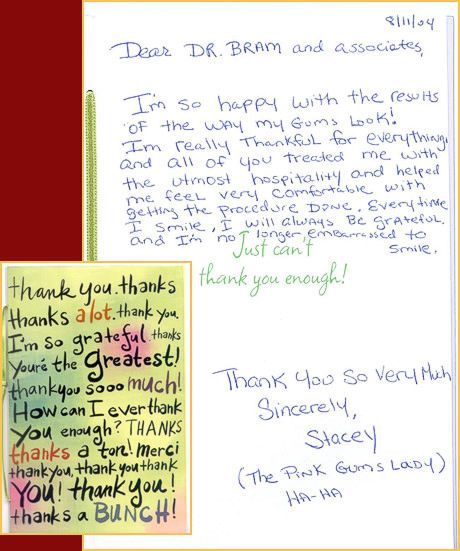 Since Dr. Bram provides all popular brands of teeth whitening.. the patient will be assured of having a dramatic final outcome.Our patient was very pleased with her treatment results. She regained her confidence to smile again. Her smile now appears in two places.... a smile with her mouth... and with her eyes. Below is an unsolicited testimonial - Thank You note Dr. Bram later received from the patient. Notice how she developed her own new nick name.